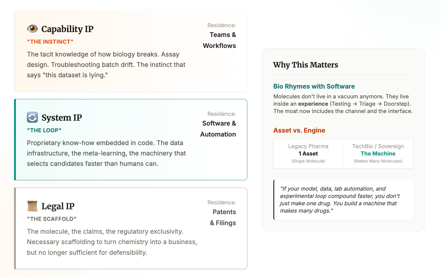 Above that is capability IP: the tacit knowledge of how biology breaks in the real world. Assay design. Troubleshooting. Batch drift. The instinct that tells you “this dataset is lying” before the slide deck does. This doesn’t live in a patent. It lives in teams and workflows.