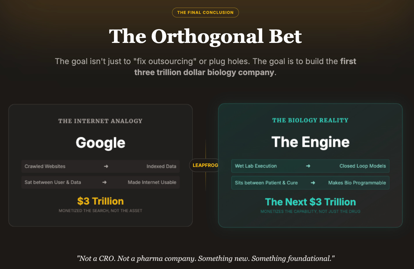 This is not only about plugging holes in the current system or rebuilding lost capacity. It is about asking the bigger question. What if the right answer is not ‘fix pharma’? What if the right answer is ‘build the first three trillion dollar biology company’?