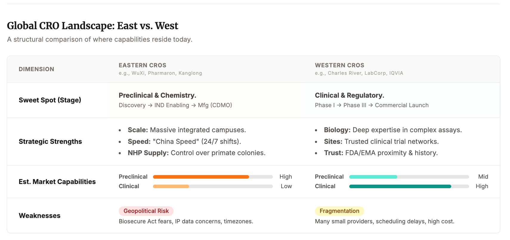 To be clear, late stage clinical execution and regulatory work is still largely run by Western global CROs, as semicon design sits in the west and is only manufactured in the East. The vulnerability sits upstream, and it rhymes on the CDMO side too: China has scale in standardized, high-volume work, but the differentiated edge is fragmented and hard to rebuild once you stop paying for it.