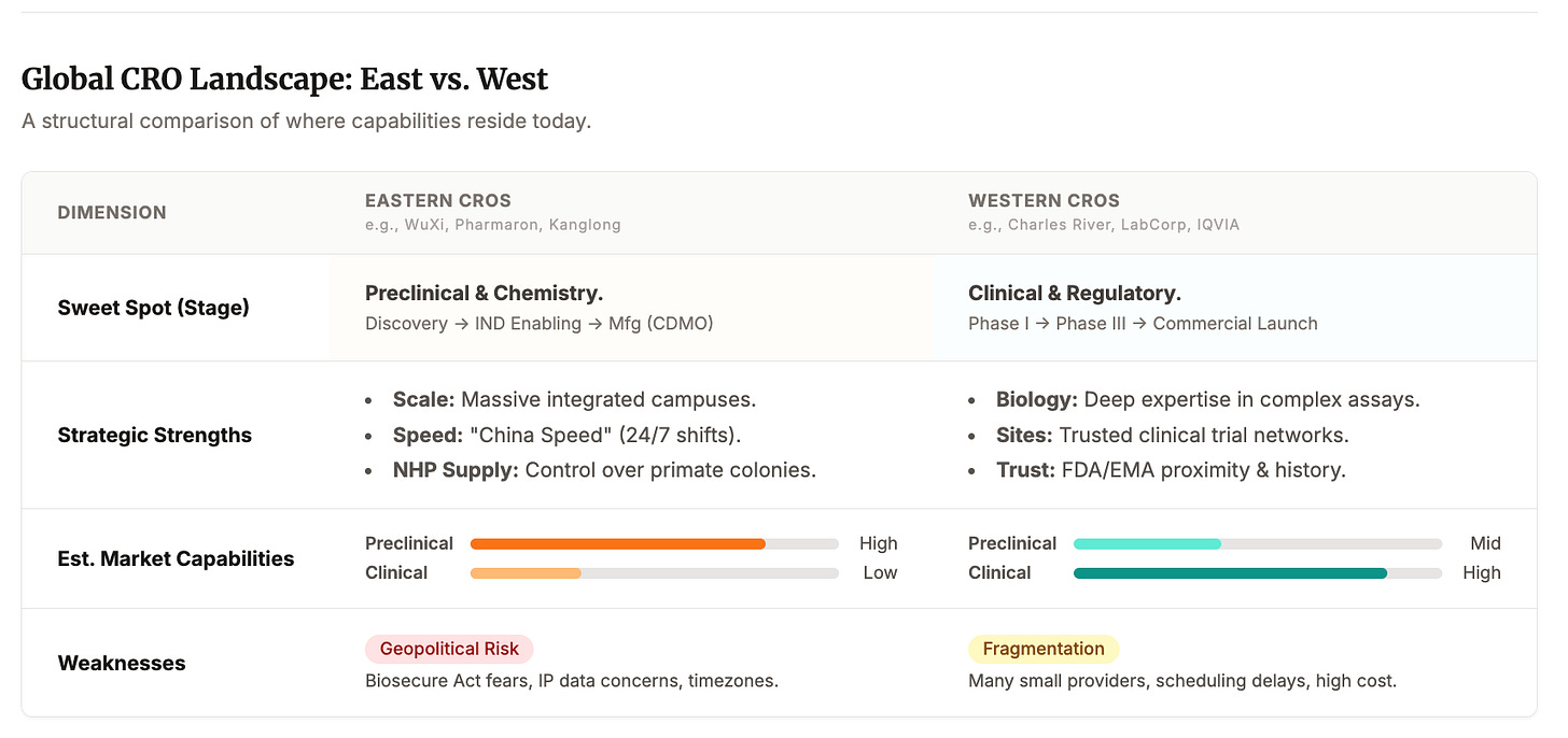 One nuance matters here. The West still runs the clinical machine. Late stage trial execution, global site networks, data management, regulatory choreography, pharmacovigilance, this is still a Western strength. This piece is not arguing we forgot how to run Phase 3. It’s arguing we made a quieter bet: that preclinical biology is a commodity you can safely rent.