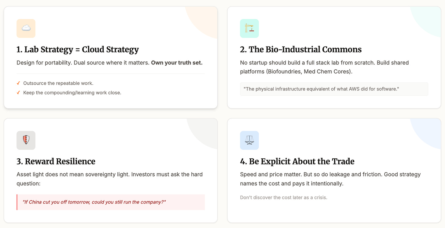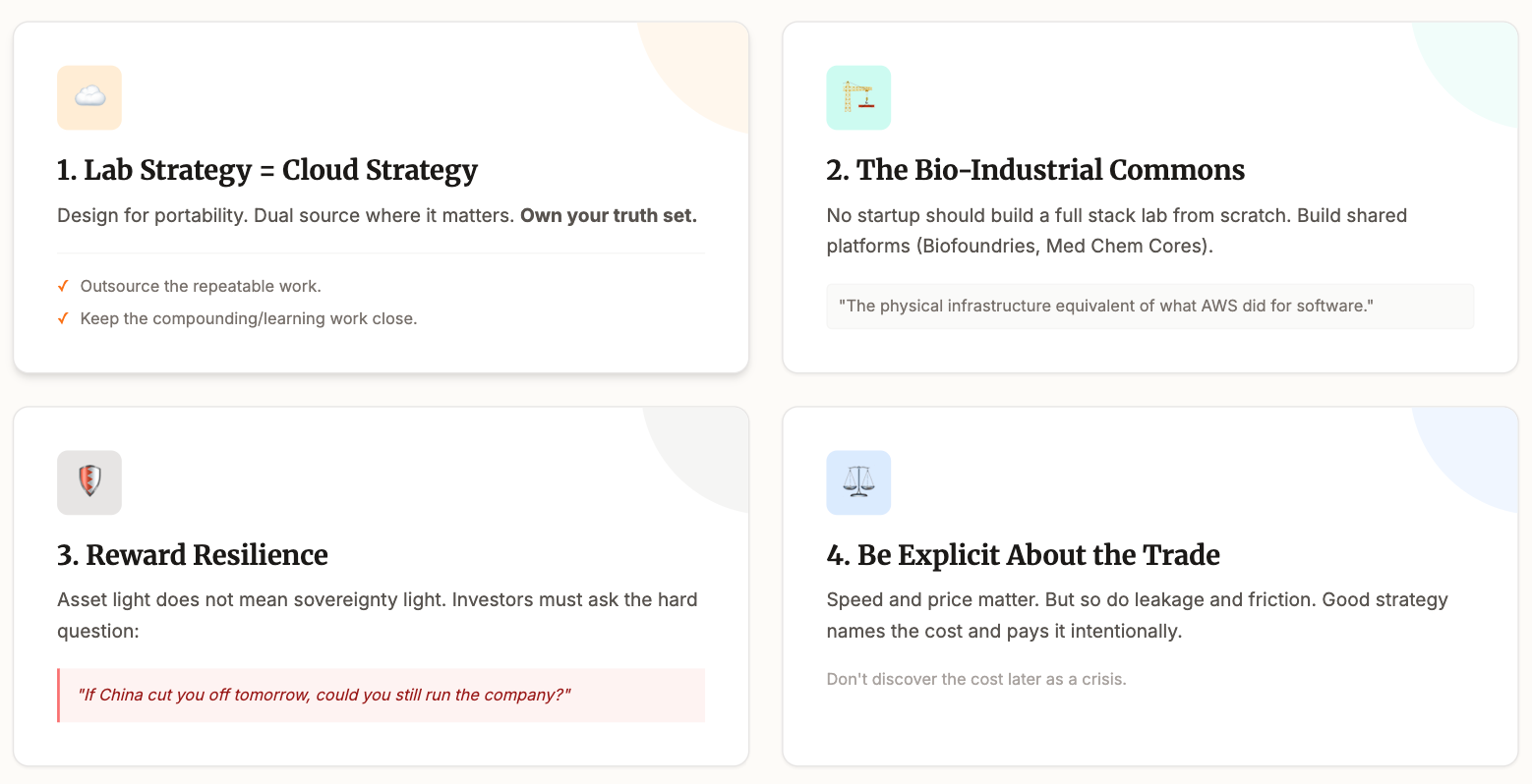 Second, invest in the bio industrial commons. No startup should build a full stack lab from scratch. But we can build shared platforms that many startups can plug into. Biofoundries. Med chem cores. Assay centers. It is the physical infrastructure equivalent of what cloud did for software.