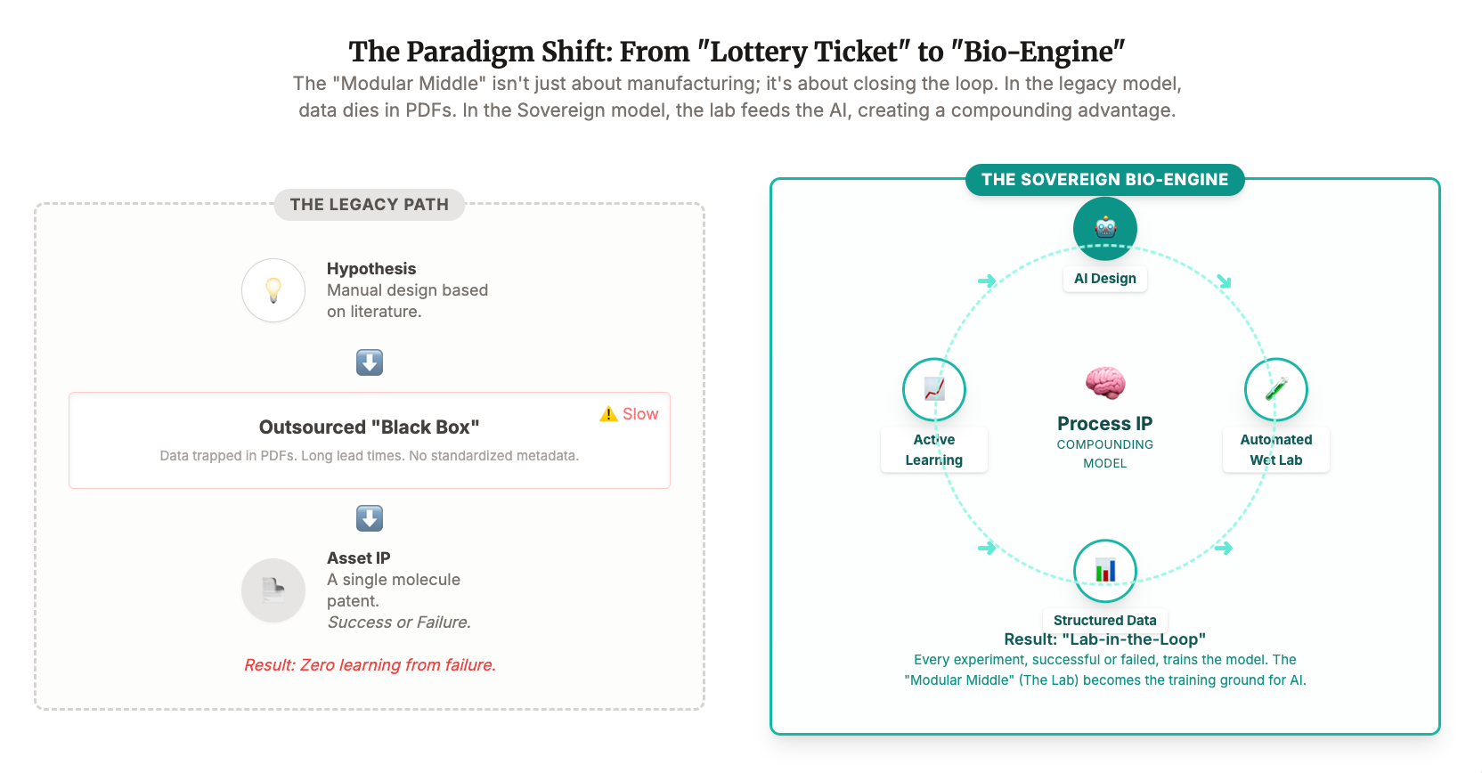 The best companies in this cycle will not just own patents. They will own the learning curve. As we approach an AI-centric world, the “10 years to clinic” metric collapses. The cycle of Design → Make → Test → Learn shrinks from months to days.