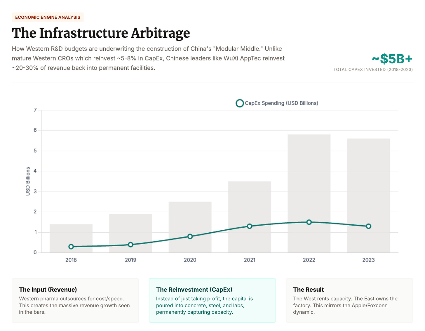 Take WuXi AppTec. In 2024, it synthesized over 460,000 new compounds. It booked RMB 25B ($3.6bn USD) in revenue from U.S.-based customers, more than 60% of its total. It reinvests 23–25% of that revenue into expanding its own capacity. That’s self-funded CapEx at geopolitical scale.