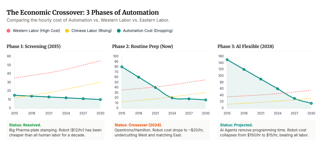 But the ground may be shifting again. Robotics, automation and agentic AI workflows are advancing faster than most biotech boards are planning for. Work that used to be manual, linear, and low margin is becoming programmable, parallel, and scalable.